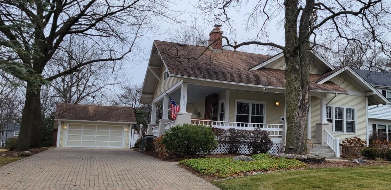 Looking for a house with lots of character, this is it! Great curb appeal with oversized wrap around front porch, mature trees & brick paver driveway. Neutrally decorated with refinished hardwood floors in living room, dining room & downstairs bedrooms, living room with fireplace and newly remodeled bathrooms. Updated kitchen with white cabinets, new stainless steel appliances and cozy breakfast nook with bay window seating and built in cabinets. Newly carpeted family room (2nd floor) with gorgeous vaulted wood ceiling and beautiful view! Primary bedroom newly carpeted with walk in closet. All bedrooms have walk in closets and ceiling fans. Large yard (76X262) with brick paver patio! Full basement & 2.5 car detached garage! New central air conditioning for 1st floor. Perfect location close to Patriot's Park, YMCA, and schools!